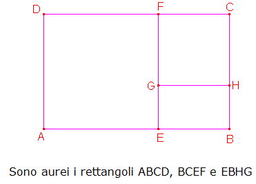 dove i puntini indicano che il numero è irrazionale. Questo numero è detto sezione aurea o numero d'oro o divina proporzione. Che cosa ha di particolare questo numero? Gli antichi Greci ritenevano che un rettangolo fosse più armonioso e bello da vedere solo se il rapporto fra la base e l'altezza fosse uguale a questo numero. Dato un segmento AB possiamo dividerlo in due parti in infiniti modi, ma in un solo caso abbiamo che il rapporto fra tutto il segmento e la sua parte maggiore sia uguale al rapporto tra la parte maggiore e la parte minore, cioè che la parte maggiore sia media proporzionale fra l'intero segmento e la parte restante. E in questo caso i due rapporti sono uguali al numero d'oro. Euclide nei suoi Elementi indica come si può dividere un segmento in proporzioni auree con solo riga e compasso. Dato il segmento AB si traccia il segmento BC uguale alla metà di AB e perpendicolare ad AB. Si traccia il segmento AC e la circonferenza con centro in C e raggio BC e si indica con D il punto di intersezione tra AC e la circonferenza. Si traccia, infine, un'altra circonferenza con centro in A e raggio AD. Il punto E d'intersezione tra la circonferenza e il segmento AB divide quest'ultimo in proporzioni auree.