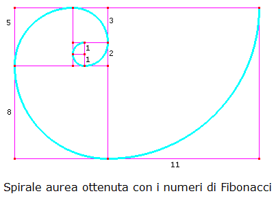 In questa successione di numeri ciascun termine, a partire dal terzo, è uguale alla somma dei due termini precedenti. Per la costruzione si parte dai due quadrati di lato 1 posti uno sull'altro. Successivamente, vengono affiancati nell'ordine gli altri quadrati in modo da ottenere un rettangolo. Infine, si tracciano i quarti di circonferenza tangenti ai quadrati. Dall'unione di questi archi raccordati si ottiene la spirale aurea approssimata detta anche spirale di Fibonacci.