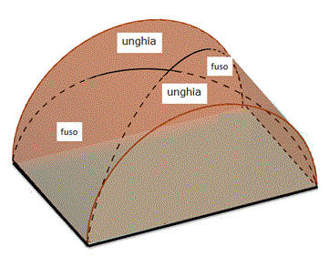Su un foglio rettangolare tracciamo le diagonali e poi incurviamolo in modo da ottenere una superficie semicilindrica. Possiamo osservare che la superficie semicilindrica è divisa in quattro parti: due fusi e due unghie.