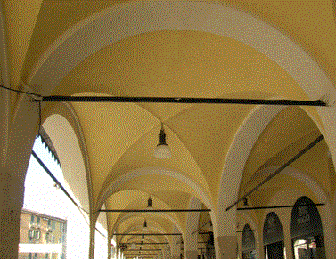 Nella figura sottostante sono illustrate volta a botte nell’ingresso che poggia su due muri paralleli e volta a crociera nel portico che poggia su quattro colonne nel palazzo Martinengo da Barco ora Beretta in via Tosio.