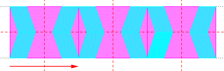 Ora, chiediamoci, oltre alla traslazione esistono altre isometrie che possono portare questa infinita successione di rettangoli su se stessa in modo che anche le copie del disegno possano sovrapporsi? Sí, sappiamo che un rettangolo torna su se stesso con l'identità, con una riflessione verticale, con una riflessione orizzontale, e con una rotazione di 180° e quindi per far in modo che questa lunghissima striscia torni su se stessa dobbiamo operare solo con queste tre isometrie e con la loro composizione. Naturalmente anche la figura di base deve poter sovrapporsi con le sue copie con le stesse isometrie. Ad esempio, se un fregio torna su se stesso sia con una traslazione e sia con una riflessione verticale la figura di base deve sovrapporsi ad una delle sue copie con le stesse isometrie e ciò è possibile solo se la figura di base possiede a sua volta un asse di simmetria verticale.