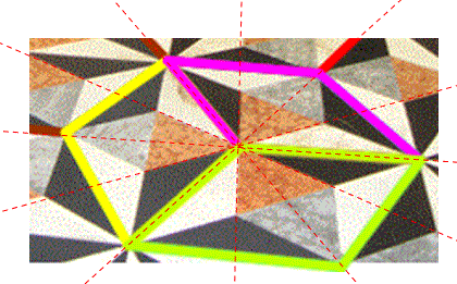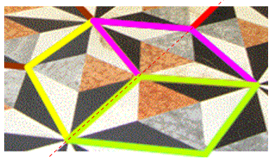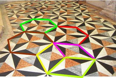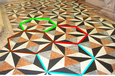Nella classificazione della pavimentazione si è tenuto conto sia delle forme geometriche che dei colori dei triangoli contenuti nei rombi. Se consideriamo solo le forme geometriche allora la classificazione cambia perchè in questo caso si possono individuare sei assi di riflessione e sei rotazioni e quindi associare la pavimentazione allo schema 17.