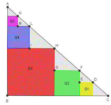 Indichiamo i lati dei quadrati Q2, Q3 e Q4 con y, x, z rispettivamente. Tenendo conto della similitudine dei triangoli