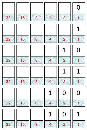 Nelle caselle bianche inseriremo le cifre del numero binario (cioè 0 oppure 1) tenendo conto del valore di posizione indicato sotto ogni casella. Ecco i numeri da 0 a 5 scritti in base 2:
