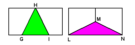 Anche i due triangoli GHI e LMN sono equivalenti ma non congruenti. Possiamo infatti, ottenere sia il primo che il secondo triangolo togliendo parti congruenti (due trapezi) a uno stesso rettangolo. Si dice che i due triangoli sono equivalenti per sottrazione di parti congruenti a figure congruenti.