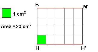 L'area del triangolo ABC è quindi uguale all'area del rettangolo che possiamo facilmente misurare con il metodo del confronto diretto con un quadrato preso come unità di misura. Possiamo cosí vedere che nel rettangolo, e quindi anche nel triangolo ABC, sono contenuti 20 quadrati di area uguale a un centimetro quadrato.