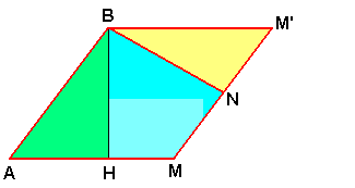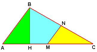 Il triangolo viene cosí suddiviso in tre parti: un quadrilatero (HBNM) e due triangoli (ABH, MNC). Se spostiamo il triangolo MNC in modo da far coincidere BN con NC otteniamo un parallelogramma.