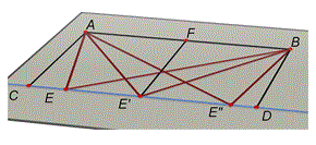 Complichiamo il problema iniziale. Siamo nella città A e dobbiamo andare nella città B passando prima a prendere l'acqua al fiume CD. Le due città sono equidistanti dal fiume e non c'è nessun ostacolo lungo i vari cammini che possiamo percorrere. Quale di questi cammini è quello più breve? Utilizziamo ancora un modello; sulla tavoletta di legno oltre ai due chiodini A e B mettiamo altri due chiodini C e D in modo che le distanze AC e BD siano congruenti. Tra i chiodini C e D fissiamo un filo di ferro contenente un anellino libero di scorrere lungo il filo. Ora mettiamo un elastico teso tra A e l'anellino e tra B e l'anellino. L'elastico si disporrà sul cammino più breve.