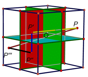Questi tre piani hanno un solo punto in comune, quale? Il centro O del cubo. Quale particolarità ha questo punto? Prendiamo un punto P del cubo, la sua immagine speculare rispetto al piano in verde sarà il punto P'. Riflettiamo il punto P' rispetto al piano in azzurro nel punto P'' e poi riflettiamo il punto P'' rispetto al piano in rosso nel punto P'''. Che cosa possiamo dire dei punti P e P'''? Sono simmetrici rispetto al punto O.