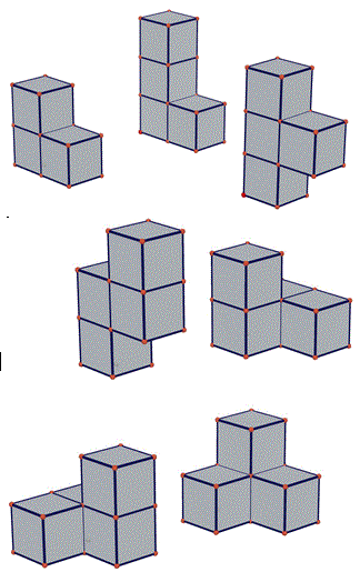 Per convincersene c'è un unico modo: costruirli e provare a muoverli. La cosa ci sorprende: i due solidi hanno spigoli corrispondenti congruenti, angoloidi corrispondenti congruenti, facce corrispondenti congruenti eppure non sono congruenti. Costruiamo allora questi sette pezzi procurandoci un listello di legno a base quadrata. E' proprio necessario tagliare 27 cubetti? No, possiamo semplificare il lavoro tagliando pezzi da 1, da 2 e da 3 cubetti.