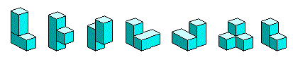 Esiste un gioco corrispondente al tangram in tre dimensioni? Cioè è possibile dividere un cubo in sette pezzi e con questi pezzi comporre figure solide equivalenti? Lo scrittore danese e inventore di giochi matematici Piet Hein ha ideato nel 1936 il gioco noto con il nome cubo Soma costituito da sette pezzi tridimensionali. Di questi sette pezzi uno è costituito da 3 cubetti e gli altri da 4 cubetti, uniti tra loro per una faccia in modo da formare i sette solidi concavi qui riportati.