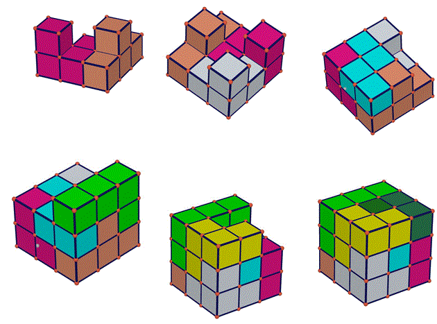 I sette pezzi del cubo Soma contengono in totale 27 cubetti (4 X 6 + 3 = 27) e possono essere assemblati in modo da formare un cubo 3 x 3 x 3 cubetti. Per comporre il cubo 3 x 3 x 3 come bisogna procedere? Esiste un solo modo? I matematici J.H. Conway e M. J. T. Guy nel 1961 stabilirono che esistono ben 240 modi diversi di ricomporre il cubo 3 x 3 x 3, escludendo simmetrie e rotazioni. Ecco una possibile soluzione: assembliamo in successione i pezzi 3, 6, 7, 4, 2, 5, 1 come è rappresentato nella figura.
