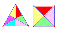 Per Platone le facce dei quattro solidi regolari (esclude il dodecaedro) sono costituite da due soli tipi di triangoli rettangoli; il triangolo rettangolo isoscele e il triangolo rettangolo scaleno. Il quadrato deriva dall'unione di quattro triangoli isosceli mentre il triangolo equilatero deriva dall'unione di sei triangoli rettangoli scaleni aventi l'ipotenusa doppia del lato minore.
