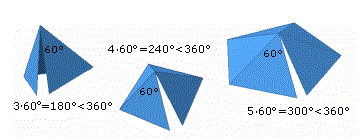 Infatti, se la somma degli angoli delle facce di un angoloide fosse di 360° allora l'angoloide non potrebbe uscire dal piano perchè rimarrebbe schiacciato sul piano e non potrebbe formare un poliedro. Vediamo allora quali poliedri regolari possiamo costruire tenendo presente questa condizione sugli angoloidi