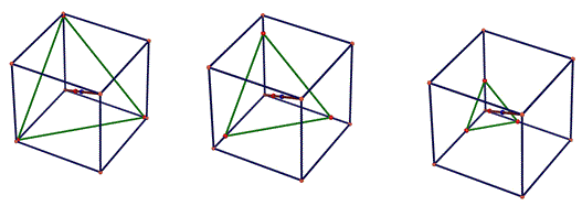 Muovendo l'elastico in avanti otteniamo altri trapezi isosceli con perimetri e aree decrescenti. Spostando l'elastico le basi maggiore e minore dei vari trapezi diminuiscono gradualmente. In particolare la base minore diminuisce fino a ridursi a un punto (l'elastico tocca un vertice del cubo) e il trapezio degenera in un triangolo isoscele. In questa situazione il piano sezione interseca solo tre spigoli tutti uscenti dallo stesso vertice. Spostando ancora in avanti l'elastico si ottengono altri triangoli isosceli con perimetri e aree decrescenti.