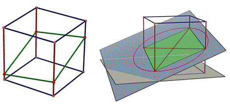 Come si può osservare il pentagono ha due coppie di lati paralleli. Sono le coppie di lati che appartengono a facce opposte del cubo. Ora sistemiamo intorno allo scheletro di un cubo un elastico in modo da ottenere il contorno di un pentagono e poi muoviamolo parallelamente a se stesso e vediamo quali sezioni possiamo ottenere.