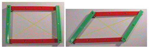 Se guardiamo lateralmente il nostro modello vediamo che i lati opposti del quadrilatero sono a due a due paralleli. Non è una coincidenza ma una verifica sperimentale di una proprietà geometrica spaziale: se un piano interseca due piani paralleli (ricordiamoci che nel cubo le facce opposte sono parallele e quindi appartengono a due piani paralleli) allora le rette intersezioni sono parallele. Un quadrilatero che ha lati opposti paralleli è un parallelogramma. Se costruiamo un modellino di un parallelogramma, imperniando a due a due quattro asticciole, ci rendiamo conto che per avere lati opposti paralleli dobbiamo necessariamente connettere lati opposti congruenti.