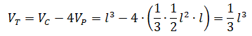 Osservando la figura vediamo che il cubo è diviso in cinque parti; un tetraedro regolare e quattro piramidi a base triangolare con una faccia triangolare equilatera e tre facce triangolari rettangolari isosceli. Indicando con l lo spigolo del cubo possiamo facilmente calcolare il volume del tetraedro Vt inscritto nel cubo togliendo dal volume del cubo Vc la somma dei quattro volumi delle piramidi Vp.