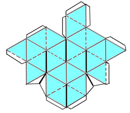 Come possiamo costruirlo? Partendo dal suo sviluppo piano formato da 24 triangoli equilateri tutti congruenti fra loro. Disegniamo i 24 triangoli equilateri con le relative linguette come indicato in figura. Poi tagliamo il contorno e le linee in grassetto, pieghiamo in avanti le linee a tratto continuo e a rovescio quelle tratteggiate. Infine mettiamo la colla sulle linguette e facciamo combaciare gli spigoli corrispondenti.