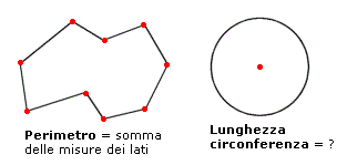 Come ben sai, il perimetro di un poligono esprime la lunghezza del contorno del poligono e si determina sommando le lunghezze dei lati. La circonferenza esprime la lunghezza del contorno del cerchio e quindi rappresenta il perimetro del cerchio. In questo caso però c'è un problema: una circonferenza non ha lati e quindi come possiamo determinarla?