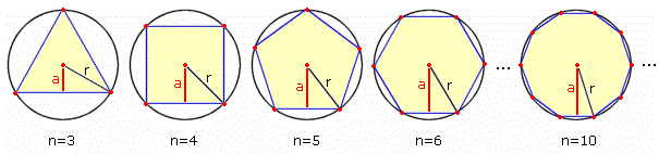 Ci accorgiamo che all'aumentare del numero dei lati, l'area dei poligoni approssima sempre meglio l'area del cerchio, cioè la differenza tra l'area del cerchio e quella del poligono diventa sempre più piccola. Inoltre il perimetro 2p dei poligoni si avvicina sempre più alla lunghezza della circonferenza e l'apotema a dei poligoni si avvicina sempre più al raggio r del cerchio. Poichè l'area di un poligono regolare è data da