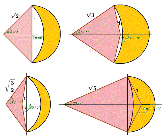 Solo cinque lunule possono essere quadrate utilizzando una riga non graduata e un compasso. In figura, le prime tre lunule sono attribuite a Ippocrate mentre le altre due sono attribuite ad Eulero.