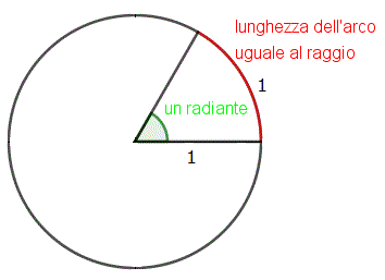 L'angolo unità detto angolo radiante è la misura di un angolo che ha vertice nel centro della circonferenza di raggio 1 e sottende un arco di circonferenza di lunghezza 1.