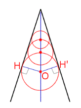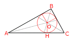 Nella figura i centri delle circonferenze si trovano sulla bisettrice dell'angolo. I raggi OH e OH' rappresentano le distanze (uguali) del centro O dai due lati dell'angolo. Consideriamo ora un triangolo qualsiasi ABC. Ci chiediamo: esiste una circonferenza interna al triangolo che sia tangente ai tre lati? Se una tale circonferenza esiste dovrà avere il centro sulle tre bisettrici del triangolo perchè la circonferenza deve essere tangente ai lati dei tre angoli. Ma noi sappiamo che le tre bisettrici di un triangolo si incontrano in un punto comune, l'incentro. Si può allora verificare facilmente che la circonferenza cercata è proprio quella che ha il centro nell'incentro O del triangolo e il raggio uguale alla distanza OH dell'incentro da uno dei tre lati.