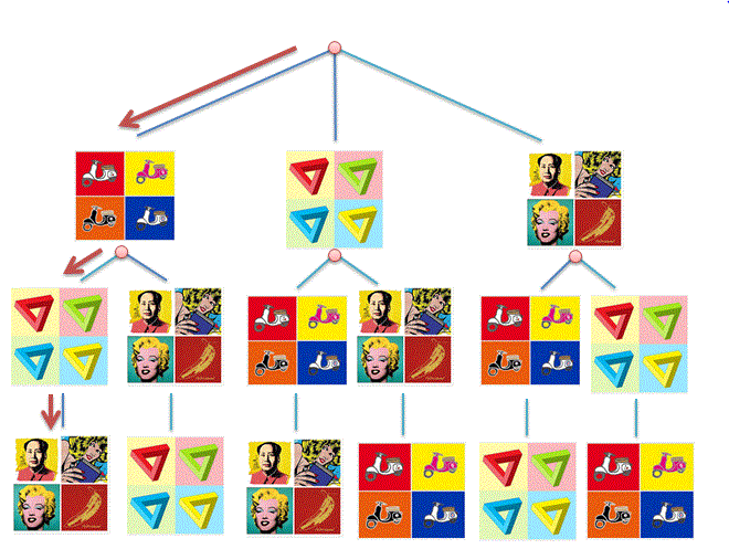 il percorso mostrato dalle freccie indica un allineamento in cui è stato scelto per primo il poster con le moto, per secondo quello con i triangoli