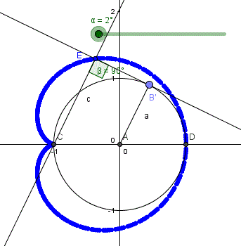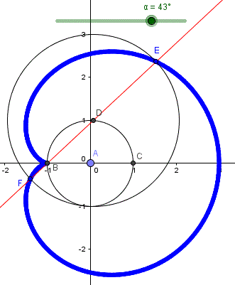 Tracciamo la circonferenza di raggio r=1 e centro in A (0, 0) nel piano cartesiano. Prendiamo i punti B(-1, 0) e C(1,0). Prendiamo sulla circonferenza un punto D e tracciamo la secante BD. Tracciamo la circonferenza con centro in D e raggio R=2. Questa circonferenza interseca in E e F la secante BD. Il luogo tracciato da E e F al variare di D sulla circonferenza è una cicloide.