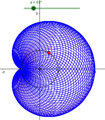 Tracciamo la circonferenza di raggio r=1 e centro in A (0, 0) nel piano cartesiano. Prendiamo il punto B (-1, 0) e dividiamo la circonferenza in 12 archi uguali segnando i punti C, D, E, F, G, H, I, L, M, N, O. Tracciamo le circonferenze che passano per B e che hanno centro nei punti segnati sulla circonferenza. Tutte queste circonferenze danno luogo a una cardioide con la cuspide nel punto B. Possiamo anche dire che le circonferenze inviluppano la cardioide o che la cardioide è l'inviluppo delle circonferenze. Osservando la cardioide che emerge dall'insieme delle circonferenze possiamo notare che risulta tangente in qualche punto ad ogni circonferenza.