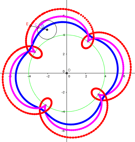 dove R è il raggio della circonferenza fissa, r è è il raggio della circonferenza mobile e a è la distanza del punto fisso dal centro della circonferenza mobile. Con a=r si ottengono le epicicloidi normali, con a<r le epicicloidi accorciate e con a>r le epicicloidi allungate.