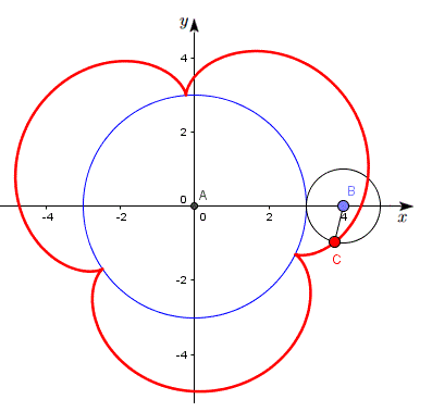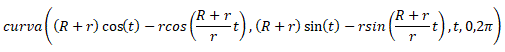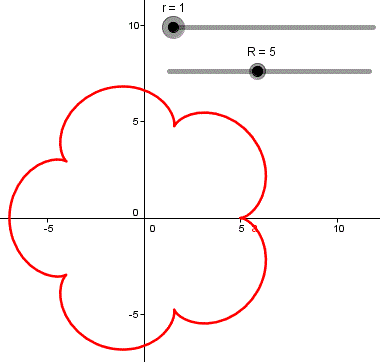 Con il software GeoGebra possiamo ottenere le epicicloidi utilizzando le equazioni della curva con il comando: