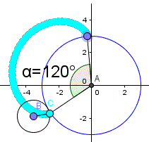 Il punto C sulla circonferenza mobile ruota contemporaneamente sia intorno al centro B che intorno al centro A. Quando ruota di un intero giro intorno a B percorre sulla circonferenza mobile un arco di 2Πr mentre sulla circonferenza fissa si sposta di un arco pari a Rα. Ad esempio nella seguente figura il punto C ha percorso un arco di 2Πr sulla circonferenza mobile e un arco di R⋅2/3 Π sulla circonferenza fissa.