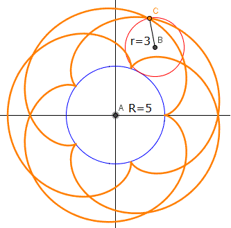 Da questa relazione si deduce che il rapporto tra i due raggi è inversamente proporzionale al rapporto tra i due archi percorsi. L'epicicloide si chiude se il punto C, dopo un giro completo intorno al punto A, ritorna nella sua posizione iniziale e ciò accade se il raggio R è un multiplo intero del raggio r, cioè R/r = numero intero. Se il raggio R è m/n volte il raggio r l'epicicloide si chiude dopo n giri della circonferenza mobile ed è formata da m lobi. Ad esempio se R = 5 e r = 3 l'epicicloide si chiude dopo 3 giri completi della circonferenza mobile ed è formata da 5 archi come si vede in figura: