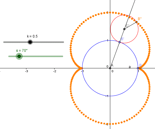 Muovendo lo slider α si ottiene l'epicicloide come luogo dei punti. Variando lo slider k varia il raggio r della circonferenza mobile e di conseguenza varia anche la forma dell'epicicloide.