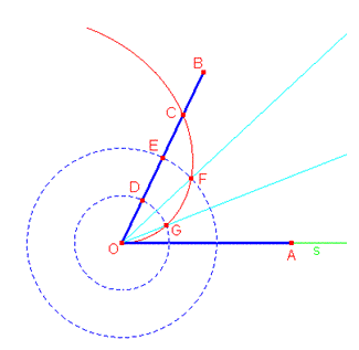Archimede costruisce sulla spirale l'angolo AOB, da dividere in tre parti uguali, in modo che il vertice O coincida con il punto iniziale della spirale, il lato OA coincida con la posizione iniziale della semiretta s che ruota e il lato OB intersechi la spirale in un punto C. Poi, divide il segmento OC in tre parti uguali OD = DE = EC e traccia due circonferenze aventi per centro O e per raggi OD e OE. Queste circonferenze intersecano la spirale in due punti F e G che individuano le due semirette OF e OG che dividono in tre parti uguali l'angolo di partenza. La giustificazione di questo procedimento deriva dal fatto che nella spirale di Archimede le distanze dei punti della curva dal polo sono direttamente proporzionali all'angolo di rotazione. Pertanto alle tre distanze uguali OD = DE = EC sul raggio vettore corrispondono i tre angoli uguali percorsi dalla semiretta s. Questo metodo può essere esteso e quindi utilizzato per dividere un angolo in un qualsiasi numero di parti uguali.