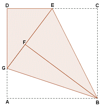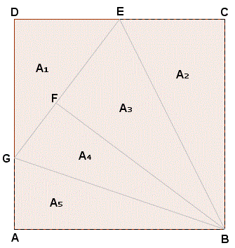 I triangoli BCE e BEF sono congruenti e quindi A2=A3. Anche i triangoli BFG e ABG sono congruenti e quindi A4=A5. Essendo la somma delle aree dei triangoli uguale all'area del quadrato si ha: