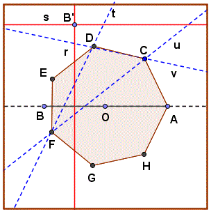 Le tre rette t, u v si intersecano nei punti C, D e F; questi punti e i loro riflessi G, H, E rispetto alla retta AB sono i restanti vertici dell'ettagono regolari.