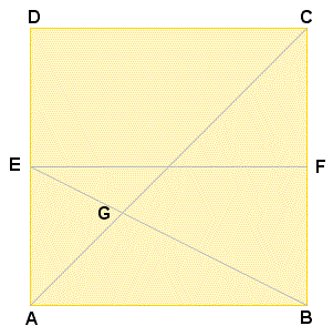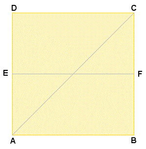 Spesso nella geometria degli origami si presenta il problema di dividere un lato del foglio in n parti uguali, dove n è un numero intero. Questo problema si risolve facilmente se n è una potenza di 2, infatti piegando a metà successivamente il foglio si divide il lato in 2, 4, 8, ... parti uguali. Ma per altri valori di n la soluzione non è cosí immediata. Vediamo come possiamo dividere il lato di un foglio quadrato in tre parti uguali. Pieghiamo il foglio lungo la diagonale AC e lungo la mediana EF.
