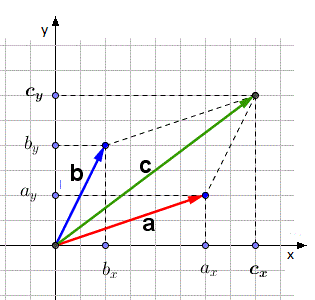 Le componenti cartesiane del vettore a sono (ax, ay) quelle del vettore b sono (bx, by) e quelle del vettore somma c sono (cx, cy) e esprimendo i vettori come somma delle componenti possiamo scrivere:
