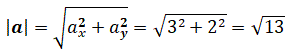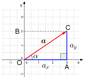 La componente cartesiana ax è uguale a +3, la componente cartesiana ay è uguale +2, le coordinate della punta del vettore a sono (ax, ay) cioè (3, 2) e la direzione del vettore a è individuata dall'angolo α che il vettore forma con il semi asse positivo delle ascisse. Inoltre, il vettore a e le componenti cartesiane formano un triangolo rettangolo dove l'ipotenusa è il vettore stesso e ax e ay sono i cateti.