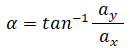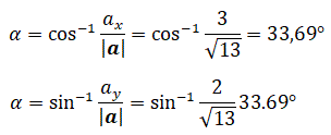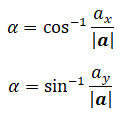 Applicando la trigonometria al triangolo rettangolo, (ricordiamo che il rapporto tra ax e il modulo di a rappresenta il seno dell'angolo α, il rapporto tra ay e il modulo di a rappresenta il coseno dell'angolo α, il rapporto tra il seno e il coseno dell'angolo α rappresenta la tangente dell'angolo α e l'inverso della tangente rappresenta l'angolo α), si ha:
