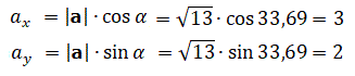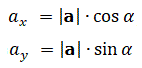 Applicando la trigonometria al triangolo rettangolo, (ricordiamo che il cateto orizzontale cioè, la componente ax, è uguale al prodotto dell'ipotenusa cioè, il modulo del vettore a, per il coseno dell'angolo adiacente e il cateto verticale cioè, la componente ay, è uguale al prodotto dell'ipotenusa cioè, il modulo del vettore a, per il seno dell'angolo opposto), si ha: