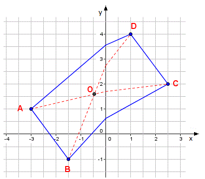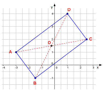 Nel piano euclideo un rettangolo ha i lati opposti paralleli e uguali, le diagonali sono uguali e si tagliano nei punti medi e gli angoli sono tutti retti come ad esempio, il rettangolo ABCD con i vertici A(-3;1), B(-1,5; -1), C(2,5; 2), D(1; 4).