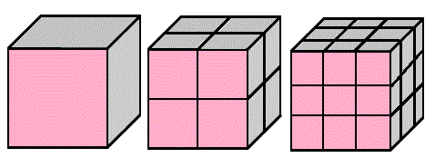 Indichiamo con s il fattore di scala, con n il numero dei cubi identici e simili a quello iniziale e con d la dimensione del cubo. Possiamo scrivere nel primo caso