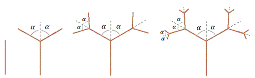 Migliorando il procedimento agendo sullo spessore del tronco e dei rami, sulla lunghezza di ciascuno dei tratti di ramo aggiunti e modificando l'angolo tra i due rami in modo casuale si ottiene un albero frattale come si vede in figura: