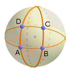 Nella geometria della sfera anche questi quadrilateri sono impossibili perchè non esistono rette parallele. In conclusione, per poter classificare i quadrilateri nella geometria sferica non bisogna utilizzare la condizione di parallellismo. Ad esempio, nella geometria sferica è possibile ottenere un quadrilatero equilatero ed equiangolo che possiamo chiamare quadrato sferico. Ad esempio, il quadrilatero sferico ABCD in figura essendo equilatero e equiangolo è un quadrato sferico.