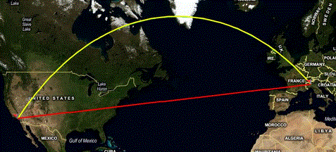 Osservando la cartina si ha l'illusione che il percorso rettilineo rosso sia minore del percorso curvo giallo, ma ciò dipende solo dal fatto che la cartina è, in questo caso, una proiezione nel piano del globo terrestre. Se i due percorsi vengono visti su un mappamondo della Terra allora la situazione si inverte.
