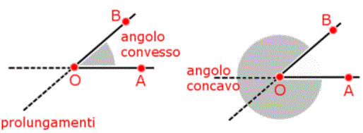Nel piano euclideo un angolo è ciascuna delle due parti illimitate di piano comprese fra due semirette che hanno la stessa origine. Un angolo è convesso quando non contiene il prolungamento dei lati, concavo quando lo contiene.